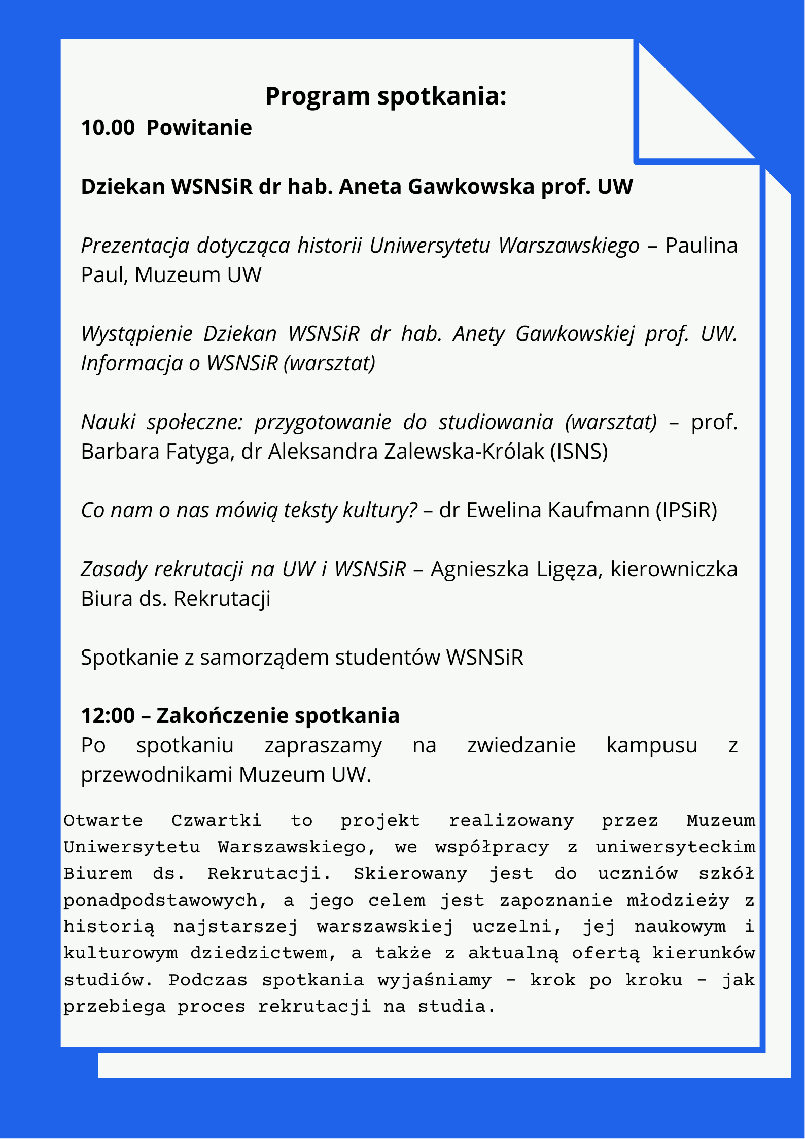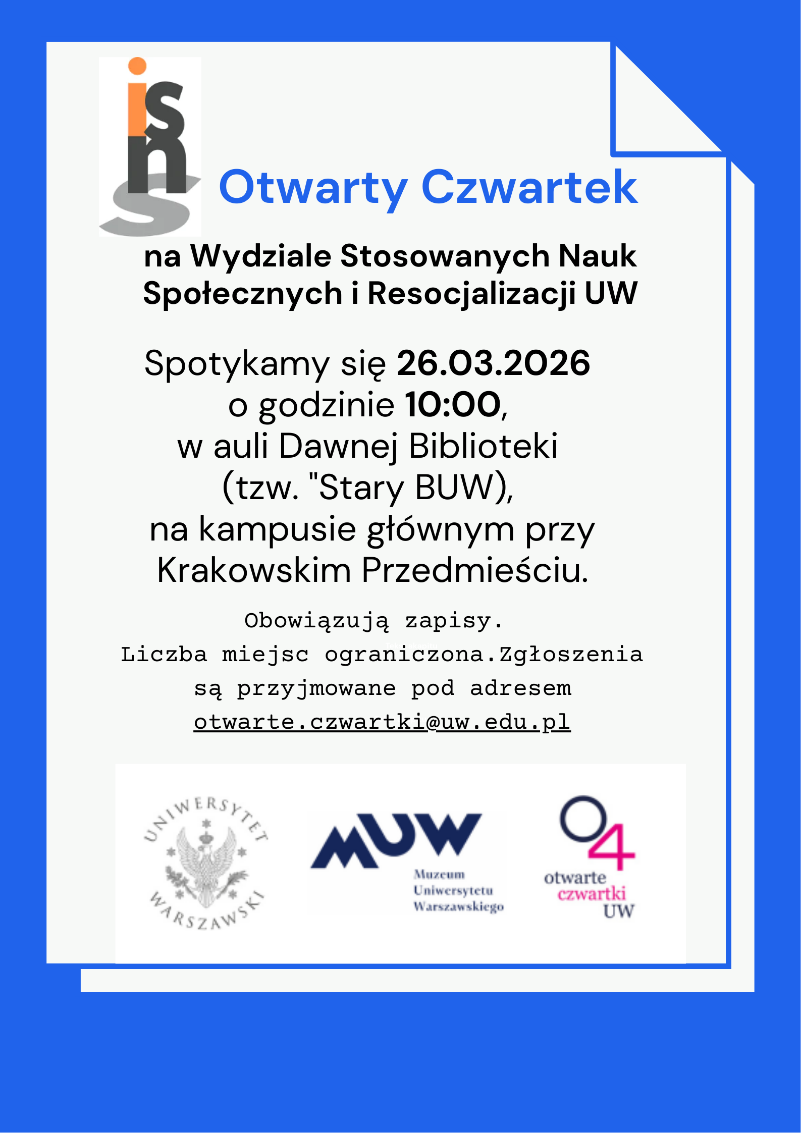 Strona główna > Aktualności > Nowości > Otwarty Czwartek na Wydziale Stosowanych Nauk Społecznych i Resocjalizacji UW Otwarty Czwartek na Wydziale Stosowanych Nauk Społecznych i Resocjalizacji UW 20 03 2026 Kategoria: Nowości https://isns.uw.edu.pl/wp-content/uploads/sites/211/2026/03/Zaproszenie-Pani-Dziekan-WSNSiR.mp4 https://isns.uw.edu.pl/wp-content/uploads/sites/211/2026/03/O4-ISNS.mp4 « Podpinanie lektoratów w USOSweb – 16–31 marca 2026